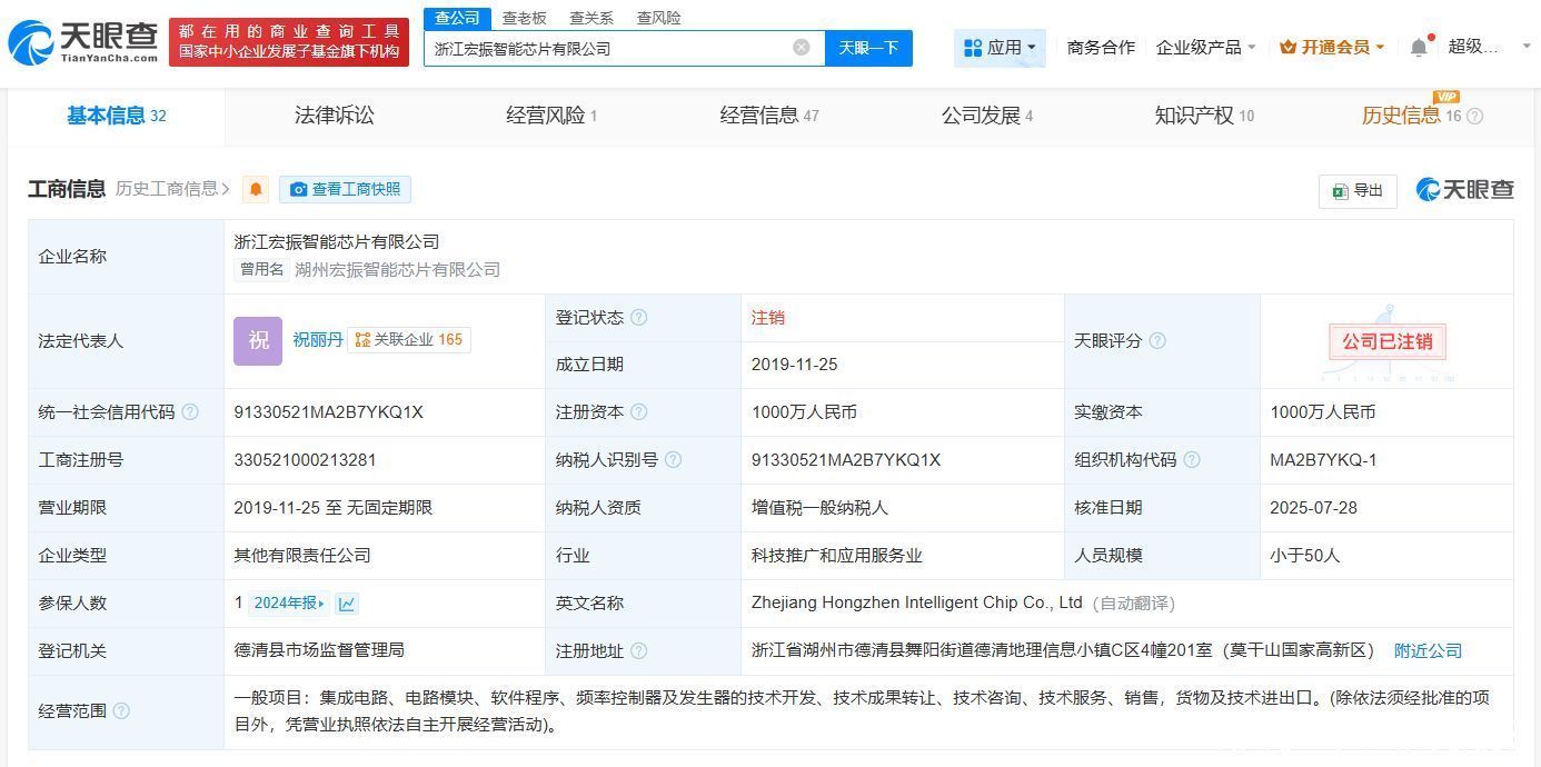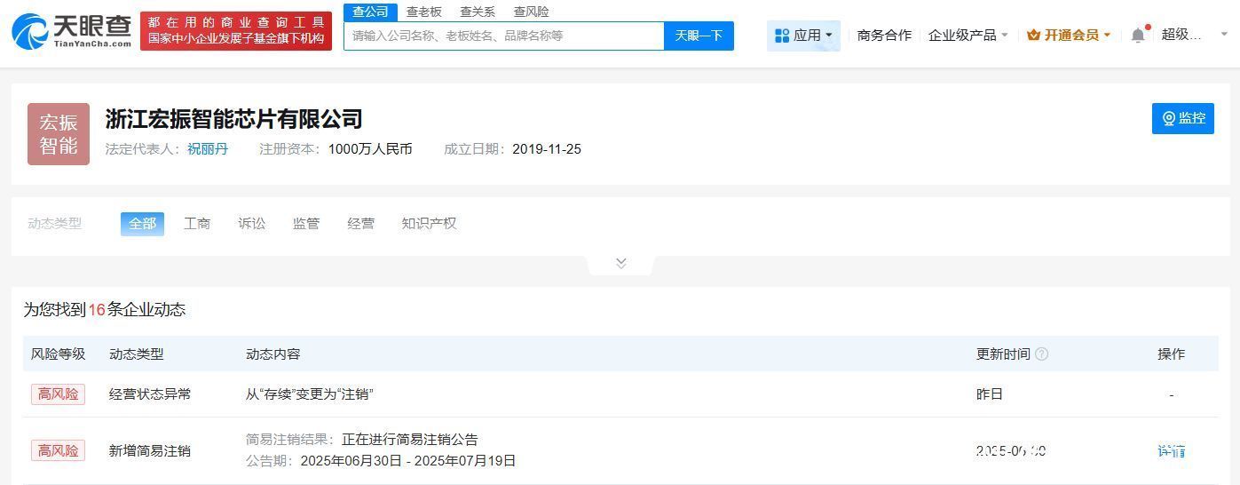 天眼查App显示,近日搜正规合法平台杠杆炒股,浙江宏振智能芯片有限公司登记状态由存续变更为注销。此前,该公司已发布简易注销公告。