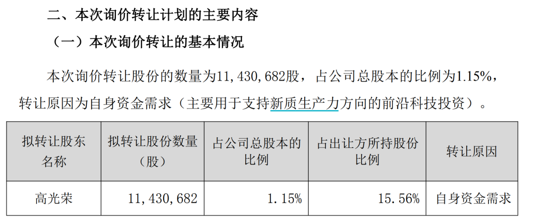 公告显示,转让原因为自身资金需求,且明确指出,主要用于支持新质生产力方向的前沿科技投资。