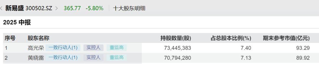 目前,高光荣虽然是新易盛第一大股东,但持股比例只有7.4%,其与持股7.13%的第二大股东黄晓雷结成一致行动人,共同控制新易盛。