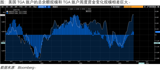 市场一直以来的逻辑是因为TGA账户余额巨大。在美国政府关门之前,大量的资金是被滞留在美国财政的企业账户上,不能支出,因而造成了流动性紧张,从而有之前我们提及的流动性紧张的压力,但是一旦确定了美国政府重新开门,那么这个时候市场又反过来过度预期,接近万亿美元级别的TGA账户会。造成大量流动性资金的涌出。但是如果我们去看一下下面这张图,也就是美国TGA账户的余额和TGA账户每周的周度资金变化,你就会发现实际上的资金变化,并不会有市场想象这么大,这些账户的余额确实有接近1万亿美元,但是这些数量并不会在短短一两个月内全部的支出完毕。